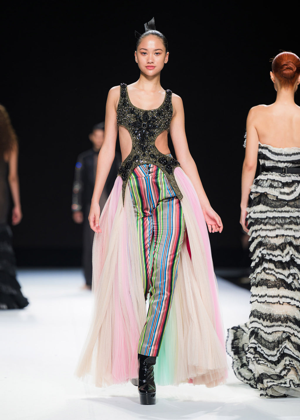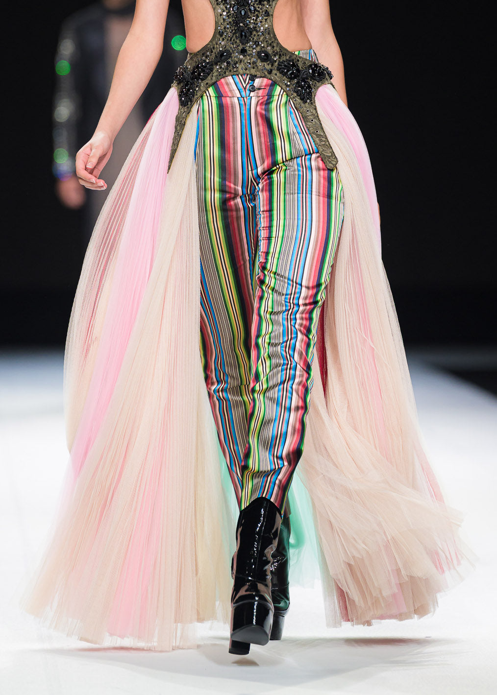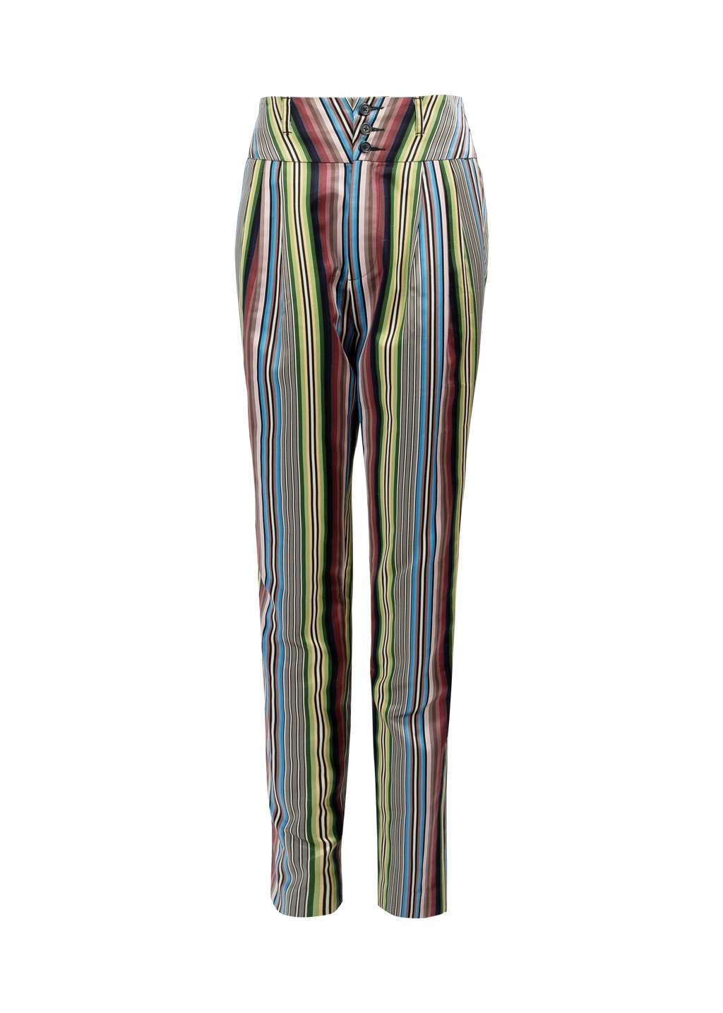 High-waisted pants crafted from multicolored silk fabric.