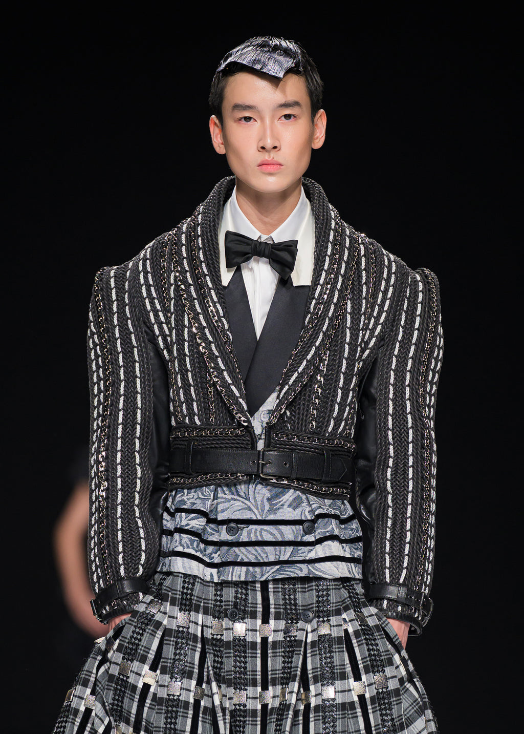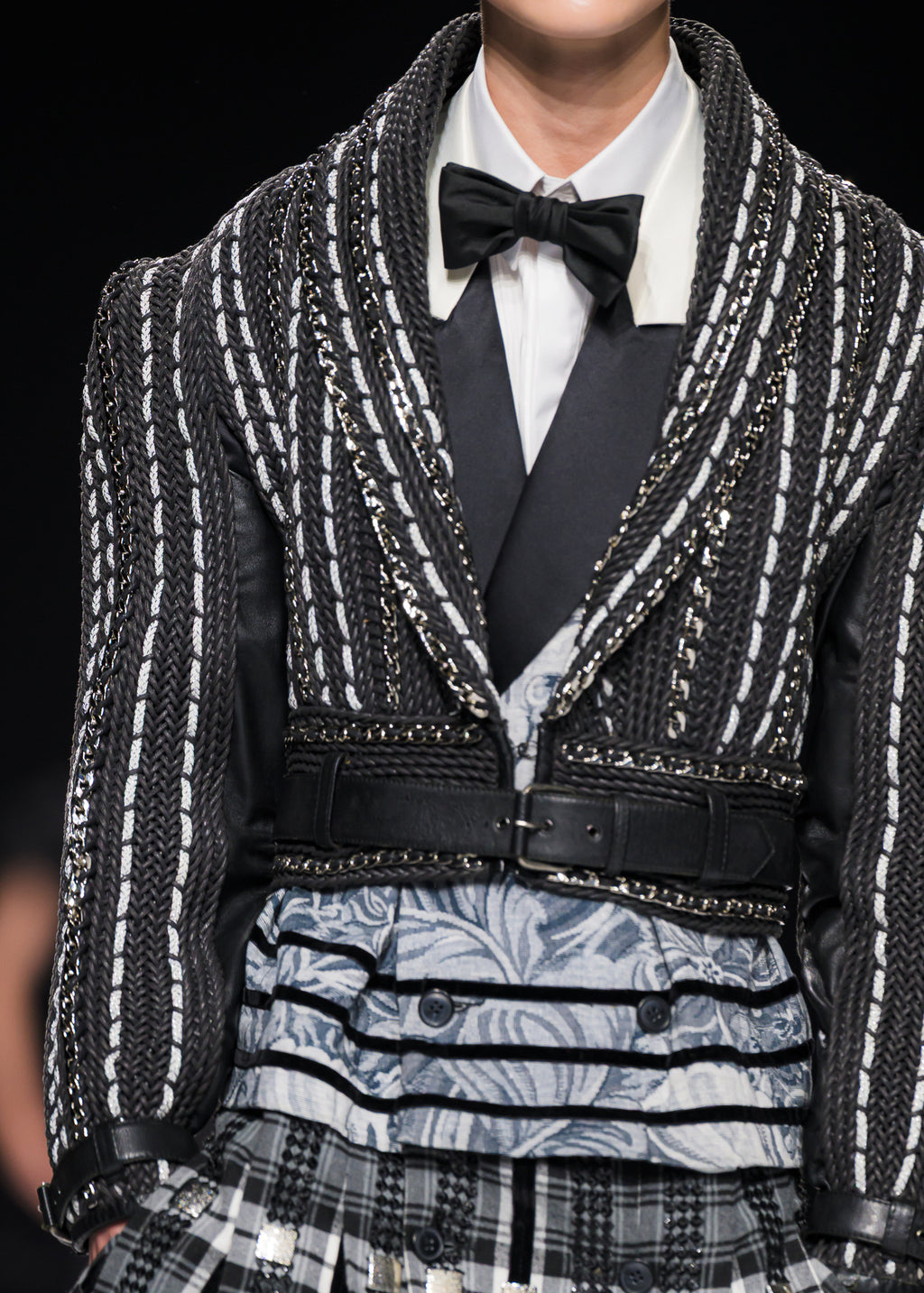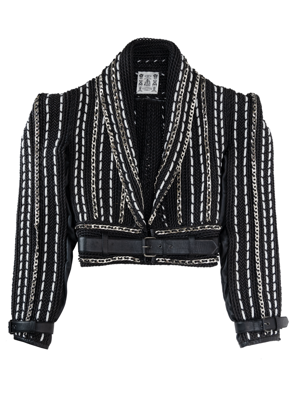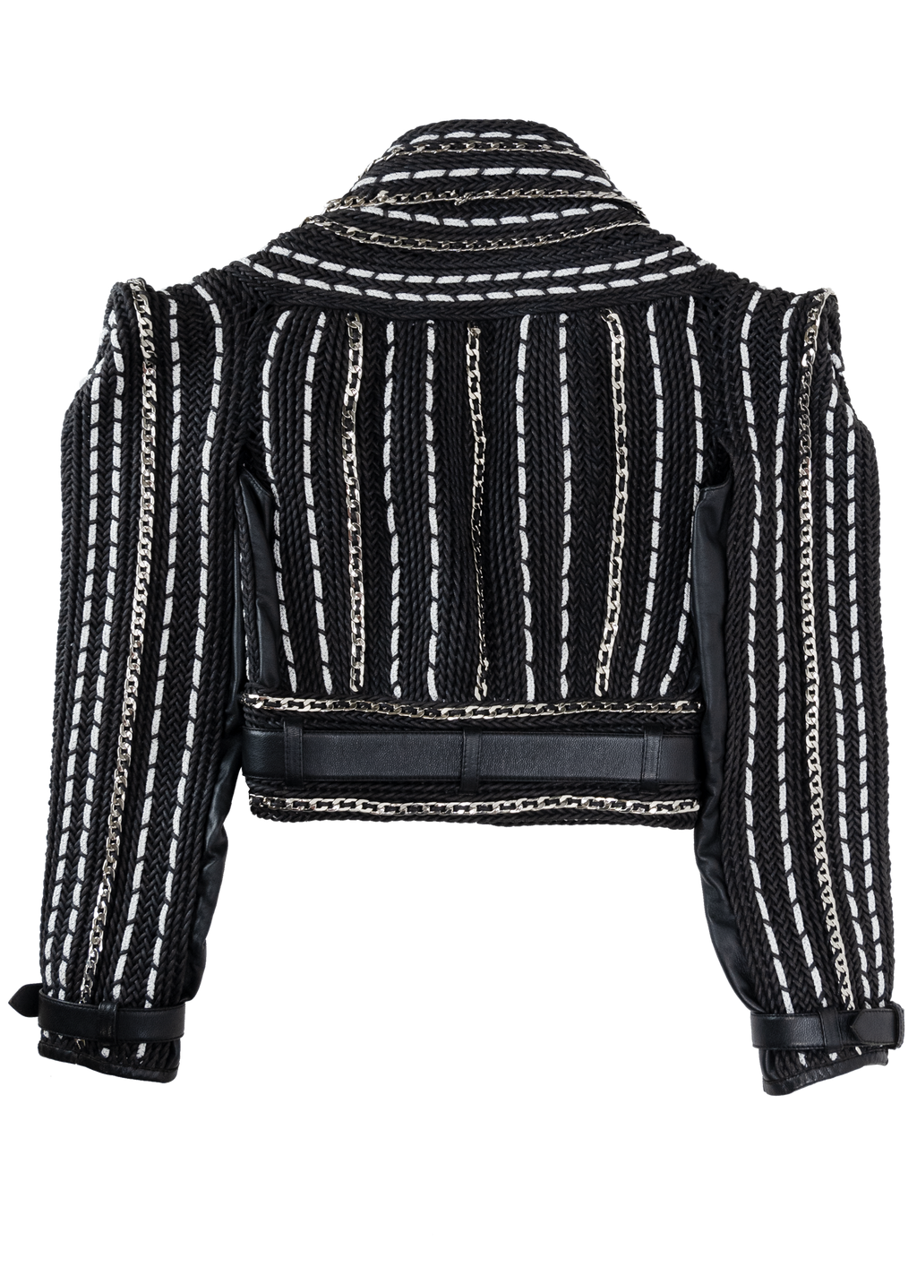 Handcrafted cropped jacket featuring black and white stripes, metal chain detailing, and a belted waist.