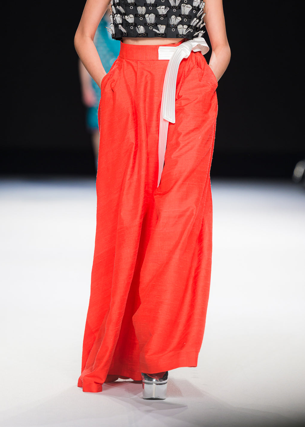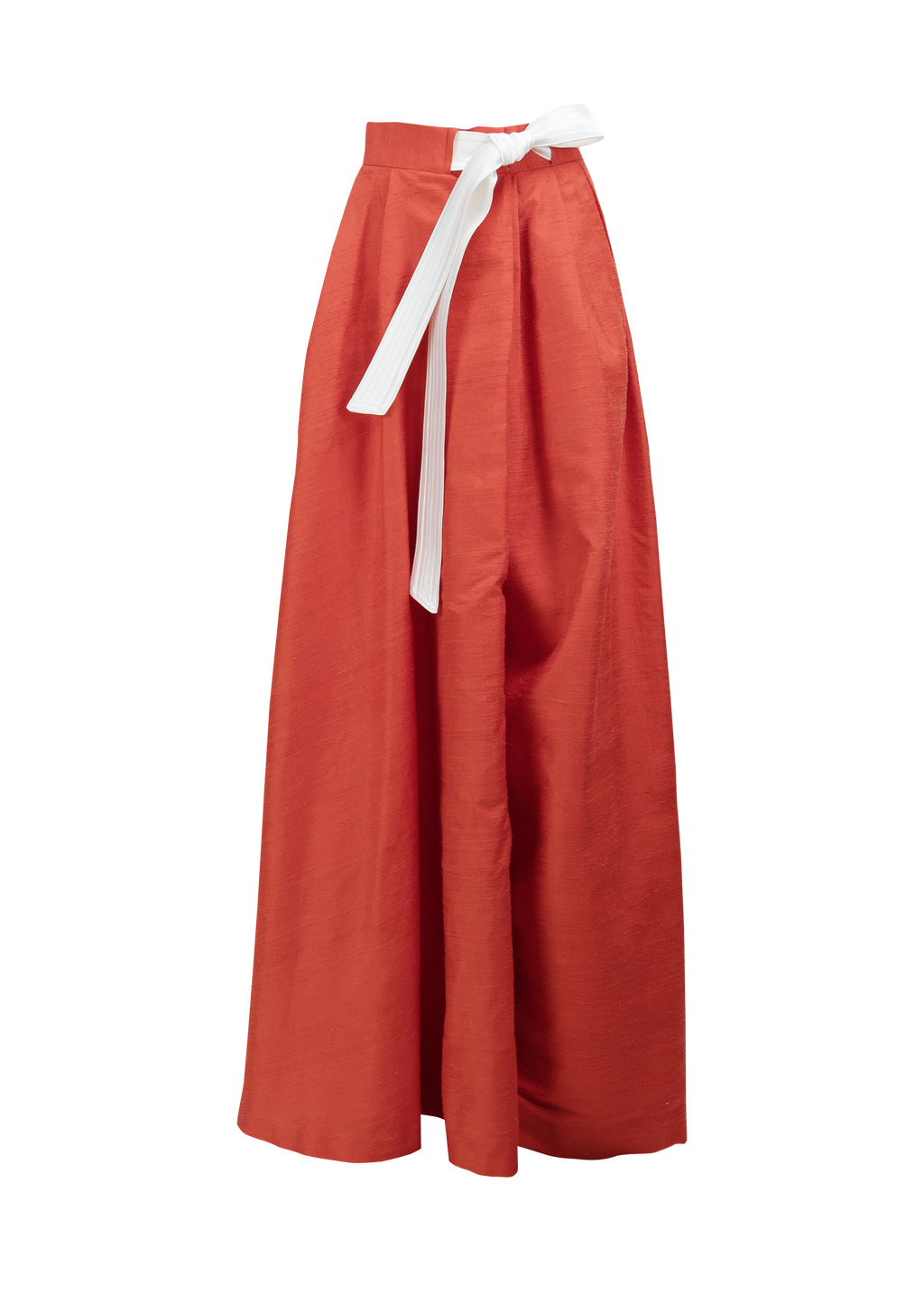 High-waisted silk pants with a wide-leg silhouette and contrast waist tie.