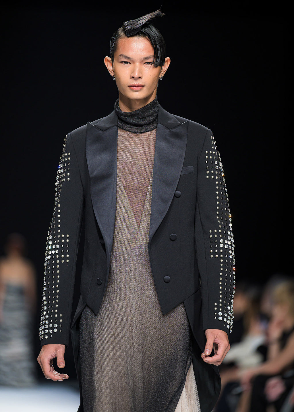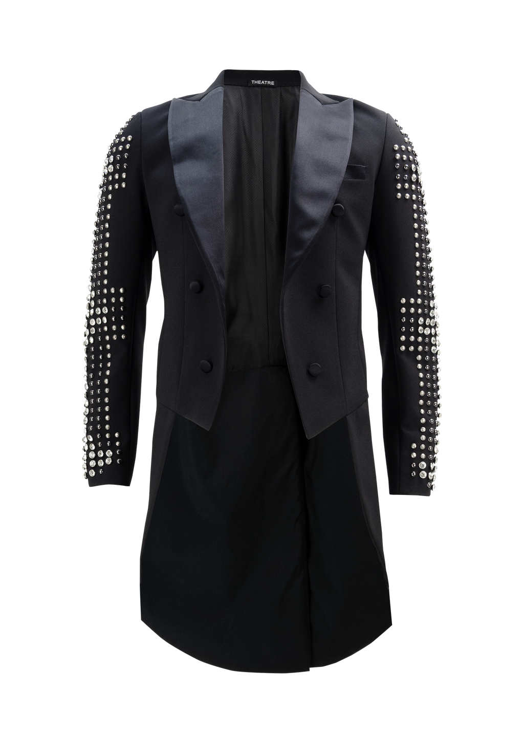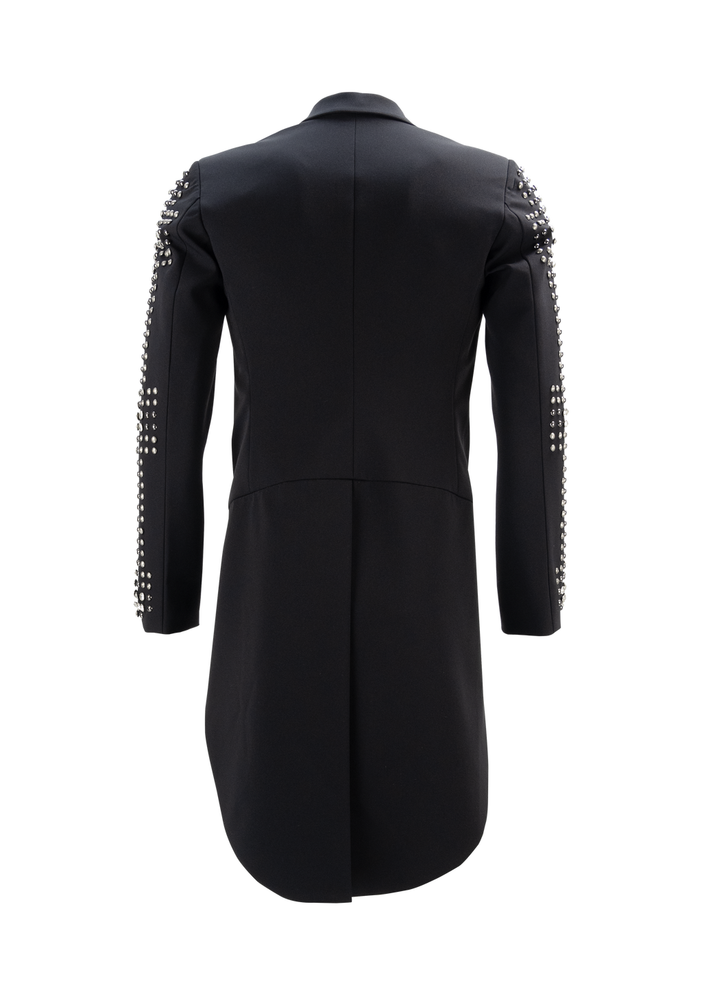 Black polyester tailcoat jacket with a cropped front, elongated back, and stud-embellished sleeves.